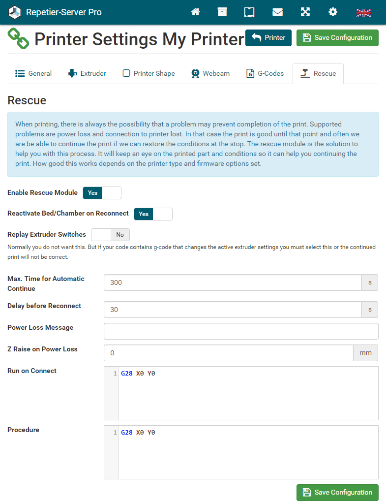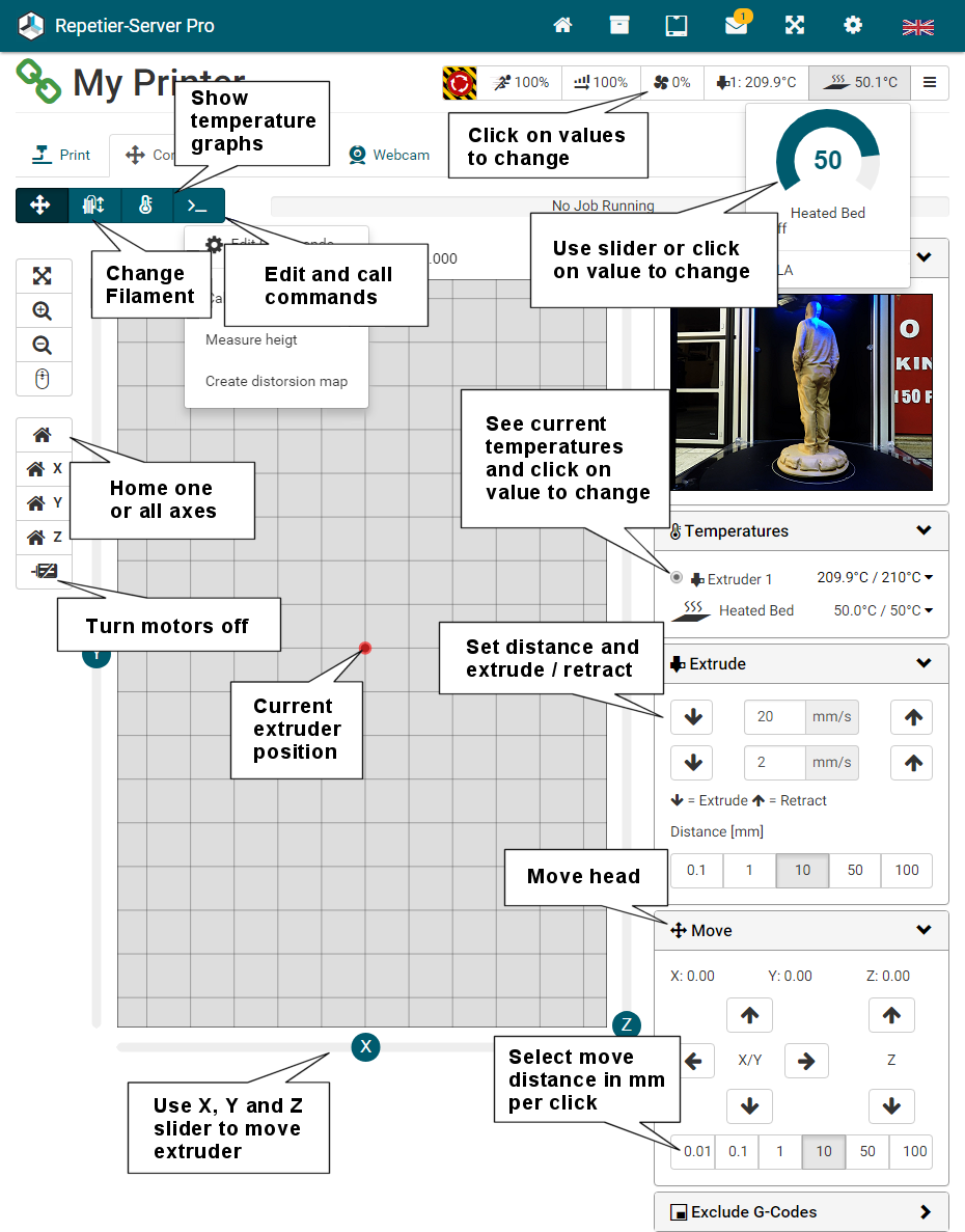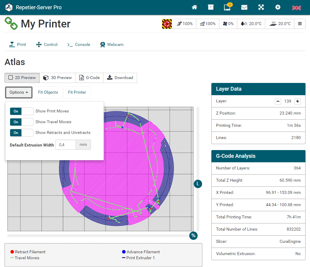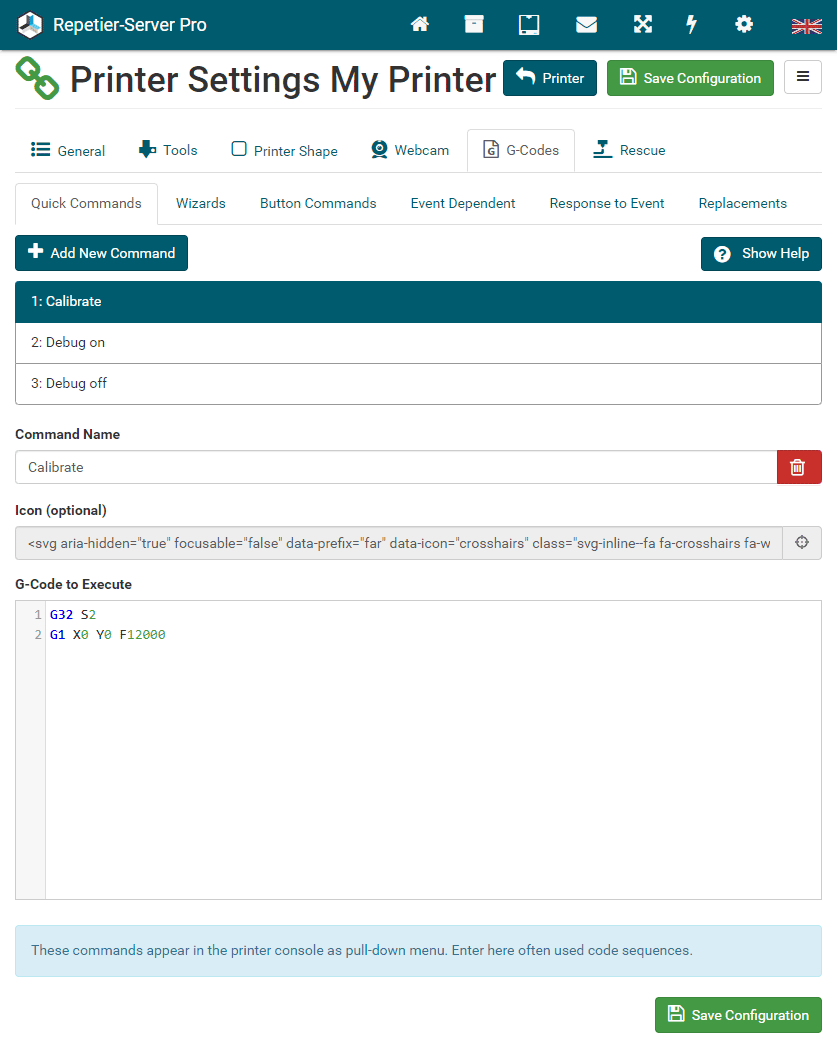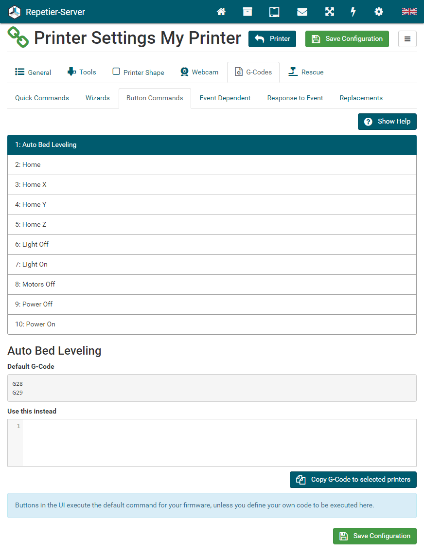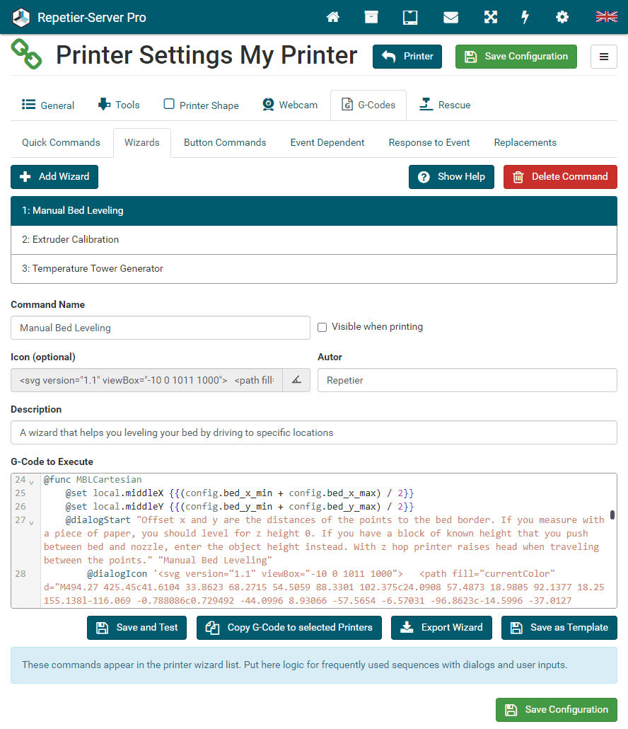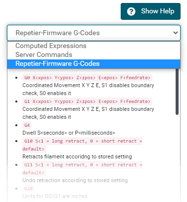 G0 X<xpos> Y<ypos> Z<zpos> E<epos> F<feedrate>G1 X<xpos> Y<ypos> Z<zpos> E<epos> F<feedrate>G4G10 S<1 = long retract, 0 = short retract = default>G11 S<1 = long retract, 0 = short retract = default>G20G21G28G29 S<0..2>G30 P<0..3>G31G32 S<0..2> P<0..1>G90G91G92G131G132G133G134 Px Sx ZxG201 P<motorId> X<pos>G202 P<motorId> X<setpos>G203 P<motorId>G204 P<motorId> S<0/1>M104M105M106M107M109M114M3M4M5M20M21M22M23M24M25M26M27M28M29M30 <filename>M32 <dirname>M42 P<pin number> S<value 0..255>M80M81M82M83M84M85M92M99 S<delayInSec> X0 Y0 Z0M104 S<temp> T<extruder> P1 F1M105 X0M112M115M116M117 <message>M119M140 S<temp> F1M163 S<extruderNum> P<weight>M164 S<virtNum> P<0 = dont store eeprom,1 = store to eeprom>M190M200 T<extruder> D<diameter>M201M202M203M204M205M206M207 X<XY jerk> Z<Z Jerk> E<ExtruderJerk>M209 S<0/1>M220 S<Feedrate multiplier in percent>M221 S<Extrusion flow multiplier in percent>M226 P<pin> S<state 0/1>M231 S<OPS_MODE> X<Min_Distance> Y<Retract> Z<Backlash> F<ReatrctMove>M232M233 X<AdvanceK> Y<AdvanceL>M251M280 S<mode>M281M300 S<Frequency> P<DurationMillis>M302 S<0 or 1>M303 P<extruder/bed> S<printTemerature> X0M320M321M322M323 S0/S1M340 P<servoId> S<pulseInUS>M350 S<mstepsAll> X<mstepsX> Y<mstepsY> Z<mstepsZ> E<mstepsE0> P<mstespE1>M355 S<0/1>M360M400M401M402M408 S<0-5>M450M451M452M453M460 X<minTemp> Y<maxTemp>M500M501M502M513M600M601 S<1/0>M602 S<1/0> P<1/0>M603M604 X<slowdownSteps> Y<errorSteps> Z<slowdownTo> T<extruderId>M908 P<<address> S<value>M999We offer manufacturers and vendors the possibility to create a custom branding for Repetier-Server Pro with own name, logo and colors and to distribute this customized version to their customers. For this a license code is required in any case. On request, we offer licence codes for resellers at reduced rates.