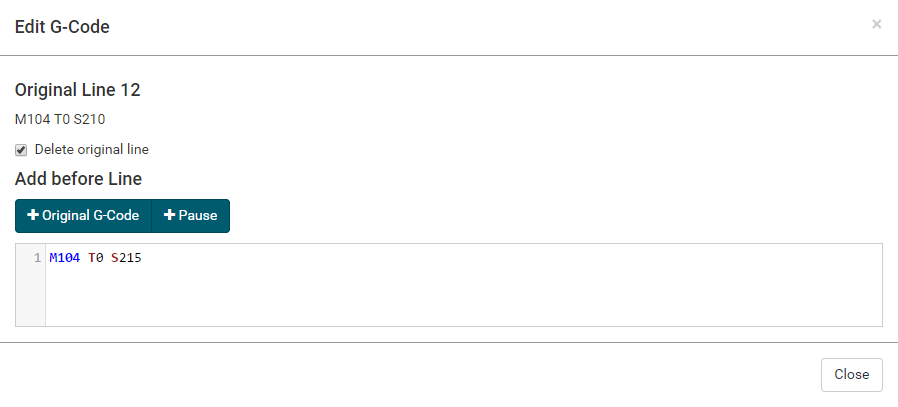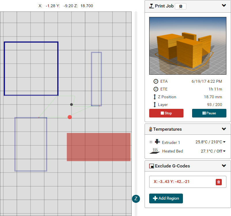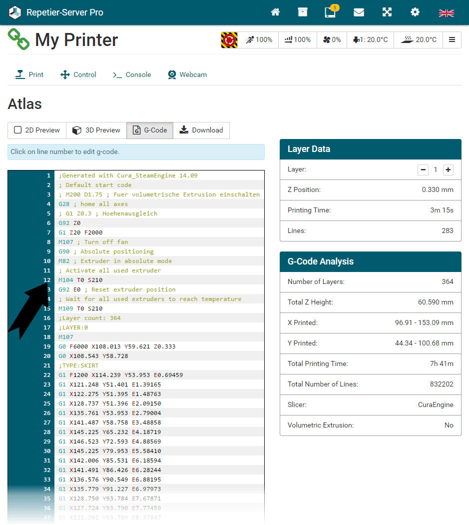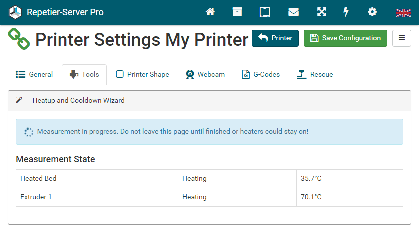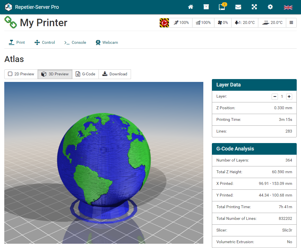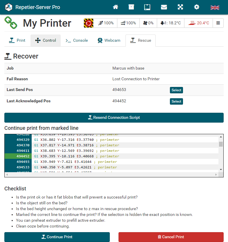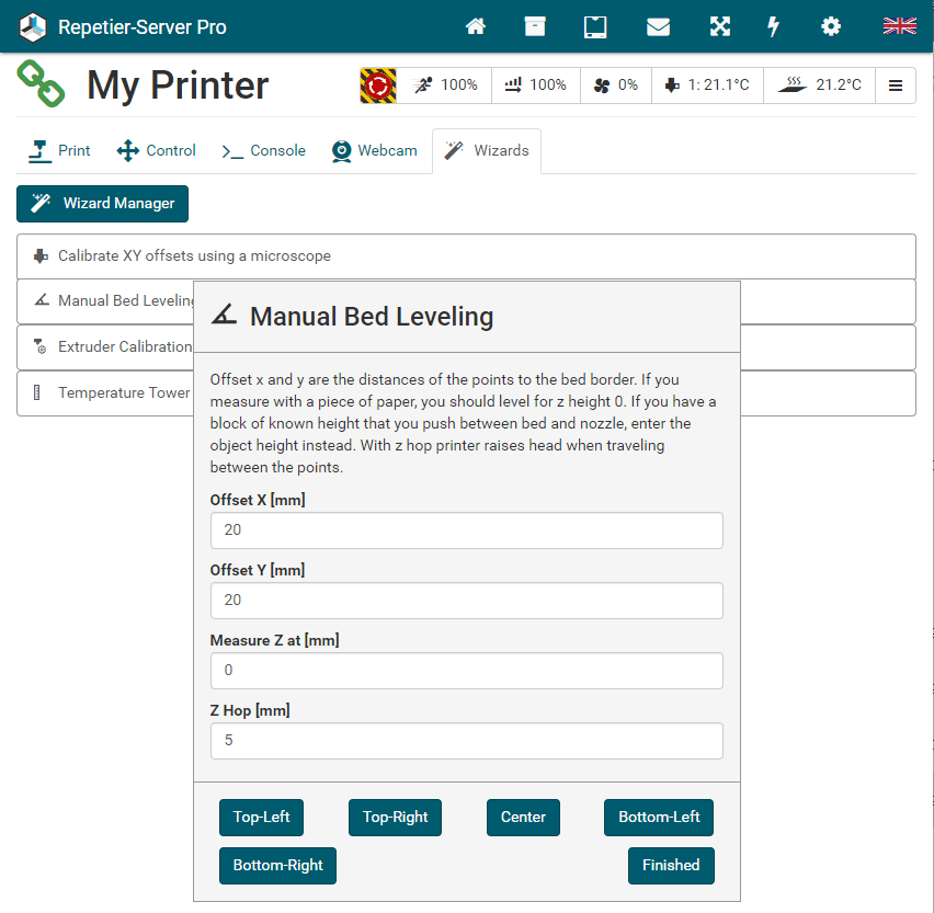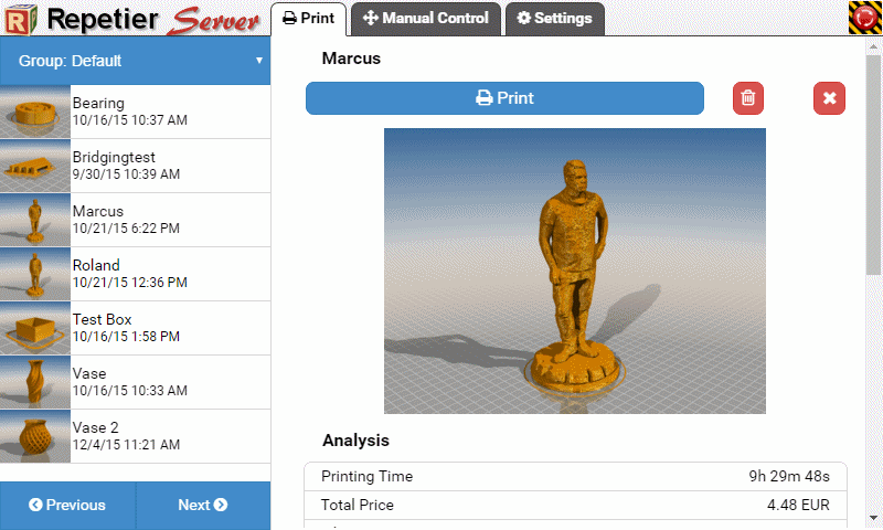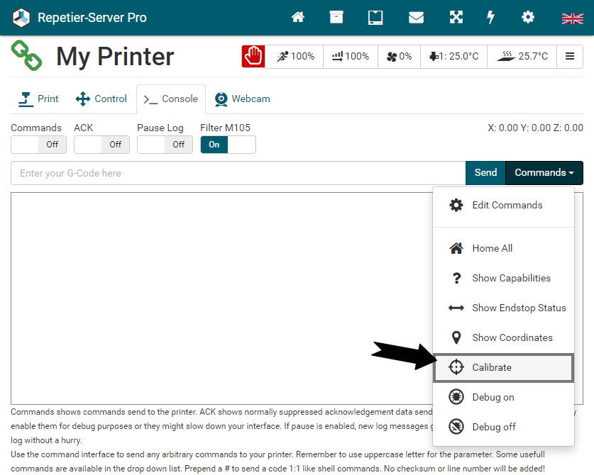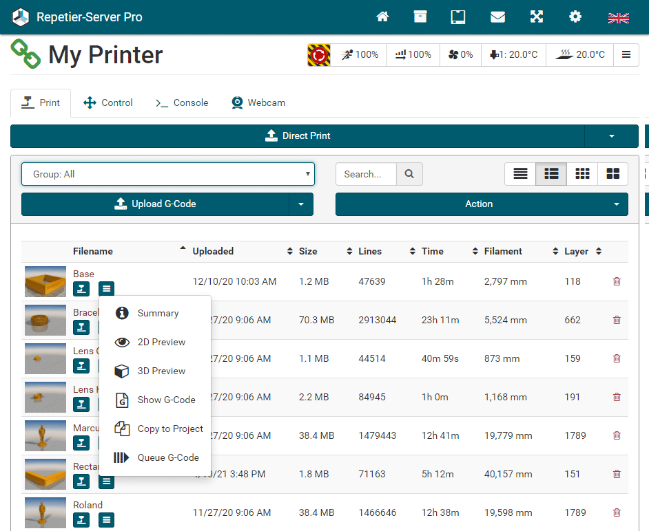 G0 X<xpos> Y<ypos> Z<zpos> E<epos> F<feedrate>G1 X<xpos> Y<ypos> Z<zpos> E<epos> F<feedrate>G4G10 S<1 = long retract, 0 = short retract = default>G11 S<1 = long retract, 0 = short retract = default>G20G21G28G29 S<0..2>G30 P<0..3>G31G32 S<0..2> P<0..1>G90G91G92G131G132G133G134 Px Sx ZxG201 P<motorId> X<pos>G202 P<motorId> X<setpos>G203 P<motorId>G204 P<motorId> S<0/1>M104M105M106M107M109M114M3M4M5M20M21M22M23M24M25M26M27M28M29M30 <filename>M32 <dirname>M42 P<pin number> S<value 0..255>M80M81M82M83M84M85M92M99 S<delayInSec> X0 Y0 Z0M104 S<temp> T<extruder> P1 F1M105 X0M112M115M116M117 <message>M119M140 S<temp> F1M163 S<extruderNum> P<weight>M164 S<virtNum> P<0 = dont store eeprom,1 = store to eeprom>M190M200 T<extruder> D<diameter>M201M202M203M204M205M206M207 X<XY jerk> Z<Z Jerk> E<ExtruderJerk>M209 S<0/1>M220 S<Feedrate multiplier in percent>M221 S<Extrusion flow multiplier in percent>M226 P<pin> S<state 0/1>M231 S<OPS_MODE> X<Min_Distance> Y<Retract> Z<Backlash> F<ReatrctMove>M232M233 X<AdvanceK> Y<AdvanceL>M251M280 S<mode>M281M300 S<Frequency> P<DurationMillis>M302 S<0 or 1>M303 P<extruder/bed> S<printTemerature> X0M320M321M322M323 S0/S1M340 P<servoId> S<pulseInUS>M350 S<mstepsAll> X<mstepsX> Y<mstepsY> Z<mstepsZ> E<mstepsE0> P<mstespE1>M355 S<0/1>M360M400M401M402M408 S<0-5>M450M451M452M453M460 X<minTemp> Y<maxTemp>M500M501M502M513M600M601 S<1/0>M602 S<1/0> P<1/0>M603M604 X<slowdownSteps> Y<errorSteps> Z<slowdownTo> T<extruderId>M908 P<<address> S<value>M999We offer manufacturers and vendors the possibility to create a custom branding for Repetier-Server Pro with own name, logo and colors and to distribute this customized version to their customers. For this a license code is required in any case. On request, we offer licence codes for resellers at reduced rates.