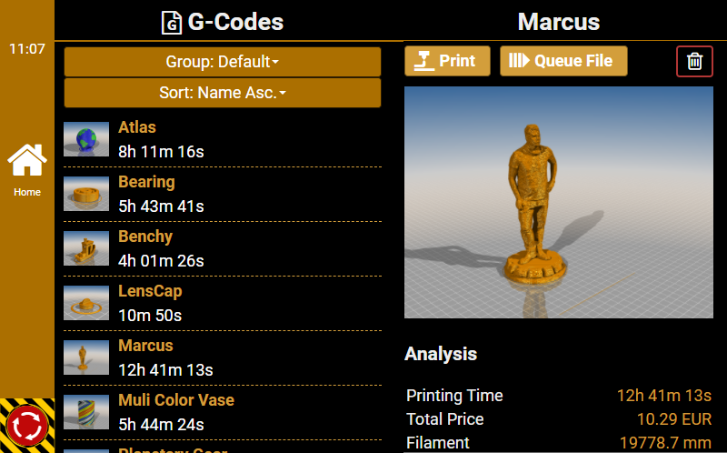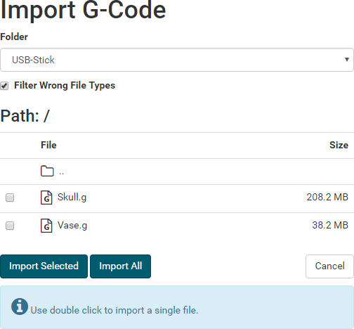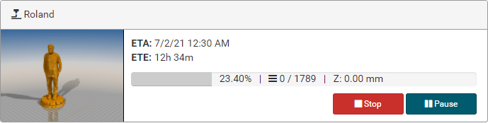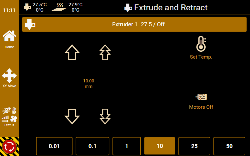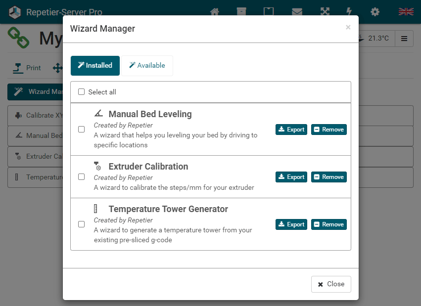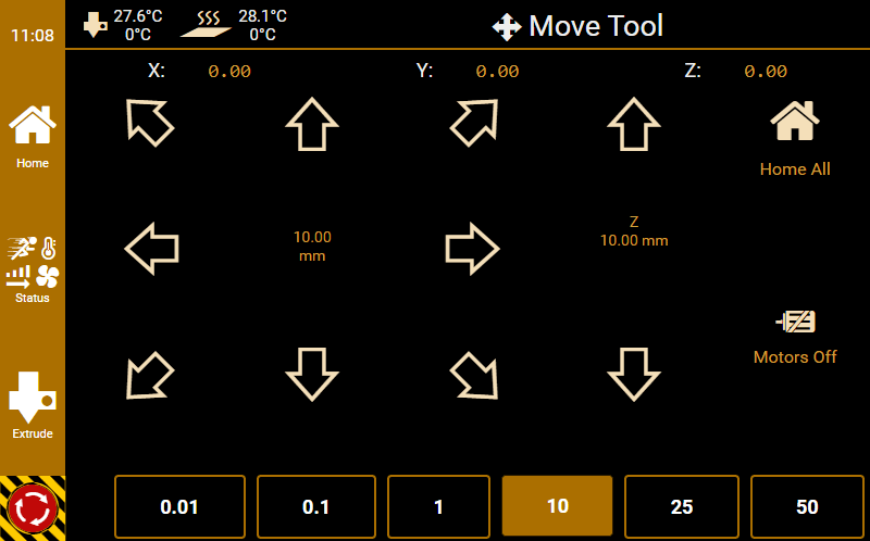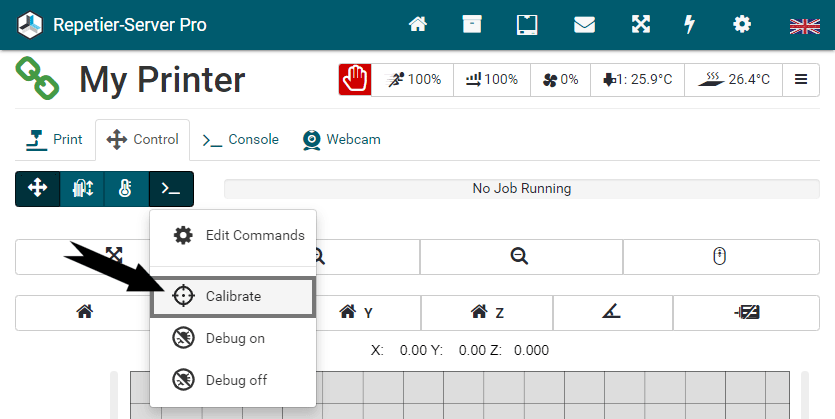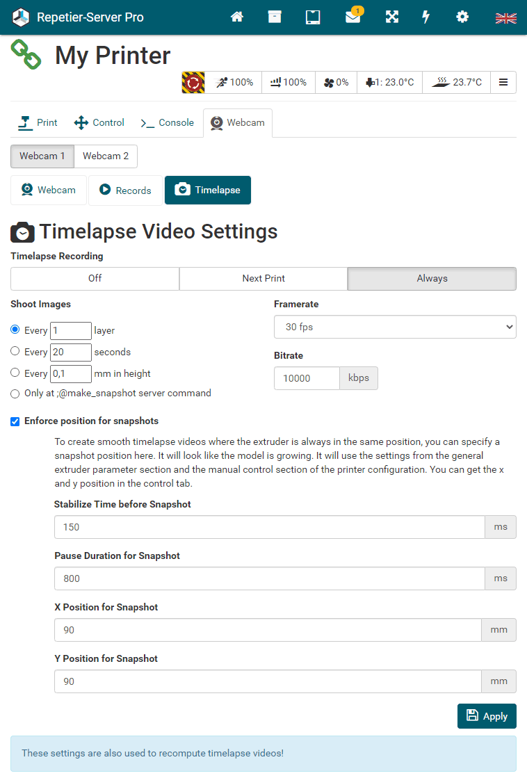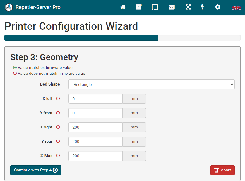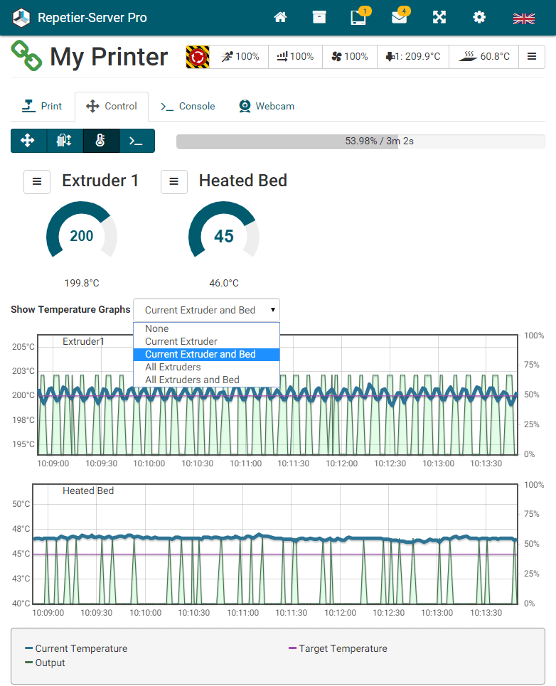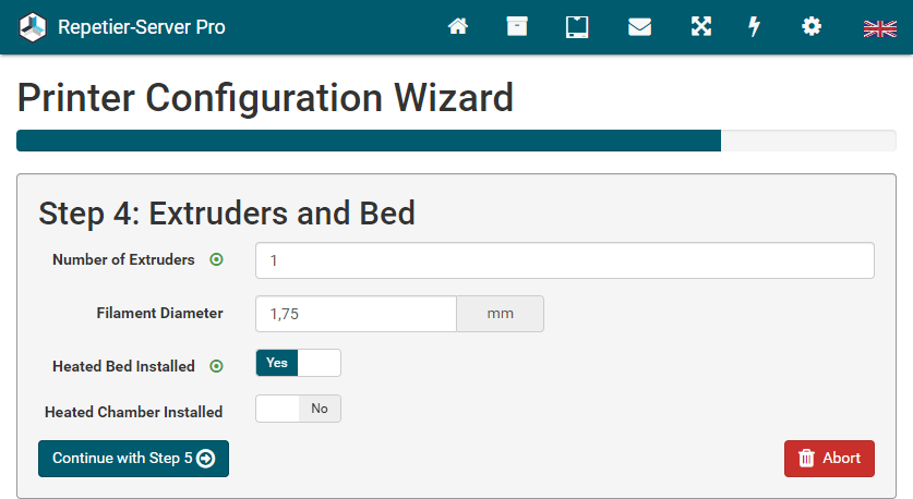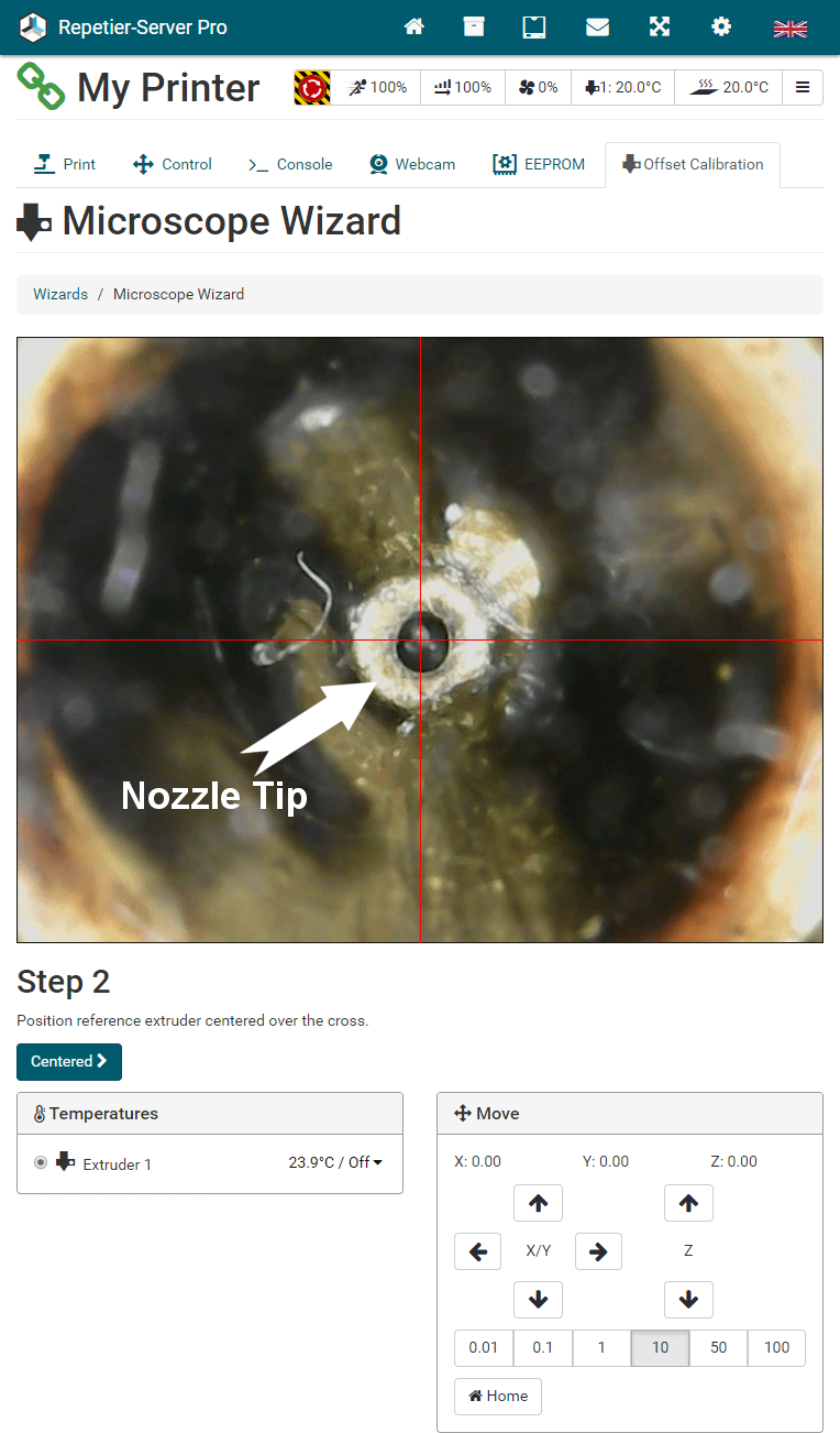 G0 X<xpos> Y<ypos> Z<zpos> E<epos> F<feedrate>G1 X<xpos> Y<ypos> Z<zpos> E<epos> F<feedrate>G4G10 S<1 = long retract, 0 = short retract = default>G11 S<1 = long retract, 0 = short retract = default>G20G21G28G29 S<0..2>G30 P<0..3>G31G32 S<0..2> P<0..1>G90G91G92G131G132G133G134 Px Sx ZxG201 P<motorId> X<pos>G202 P<motorId> X<setpos>G203 P<motorId>G204 P<motorId> S<0/1>M104M105M106M107M109M114M3M4M5M20M21M22M23M24M25M26M27M28M29M30 <filename>M32 <dirname>M42 P<pin number> S<value 0..255>M80M81M82M83M84M85M92M99 S<delayInSec> X0 Y0 Z0M104 S<temp> T<extruder> P1 F1M105 X0M112M115M116M117 <message>M119M140 S<temp> F1M163 S<extruderNum> P<weight>M164 S<virtNum> P<0 = dont store eeprom,1 = store to eeprom>M190M200 T<extruder> D<diameter>M201M202M203M204M205M206M207 X<XY jerk> Z<Z Jerk> E<ExtruderJerk>M209 S<0/1>M220 S<Feedrate multiplier in percent>M221 S<Extrusion flow multiplier in percent>M226 P<pin> S<state 0/1>M231 S<OPS_MODE> X<Min_Distance> Y<Retract> Z<Backlash> F<ReatrctMove>M232M233 X<AdvanceK> Y<AdvanceL>M251M280 S<mode>M281M300 S<Frequency> P<DurationMillis>M302 S<0 or 1>M303 P<extruder/bed> S<printTemerature> X0M320M321M322M323 S0/S1M340 P<servoId> S<pulseInUS>M350 S<mstepsAll> X<mstepsX> Y<mstepsY> Z<mstepsZ> E<mstepsE0> P<mstespE1>M355 S<0/1>M360M400M401M402M408 S<0-5>M450M451M452M453M460 X<minTemp> Y<maxTemp>M500M501M502M513M600M601 S<1/0>M602 S<1/0> P<1/0>M603M604 X<slowdownSteps> Y<errorSteps> Z<slowdownTo> T<extruderId>M908 P<<address> S<value>M999We offer manufacturers and vendors the possibility to create a custom branding for Repetier-Server Pro with own name, logo and colors and to distribute this customized version to their customers. For this a license code is required in any case. On request, we offer licence codes for resellers at reduced rates.