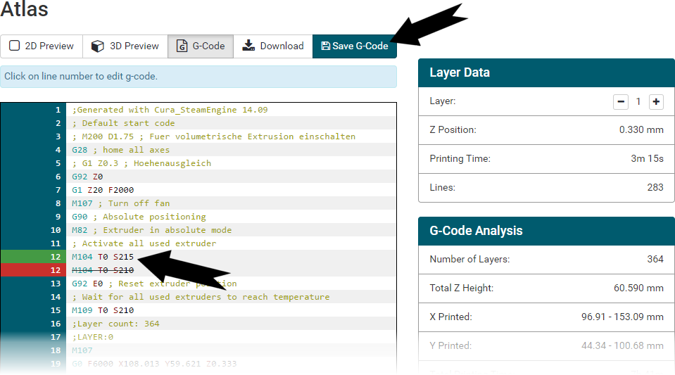 For g-code script editing we use a very comfortable code editor with a lot of features like syntax highlighting, code completion, code folding, multiple cursor, search & replace, matching close highlighting and more.