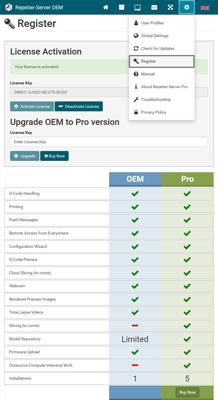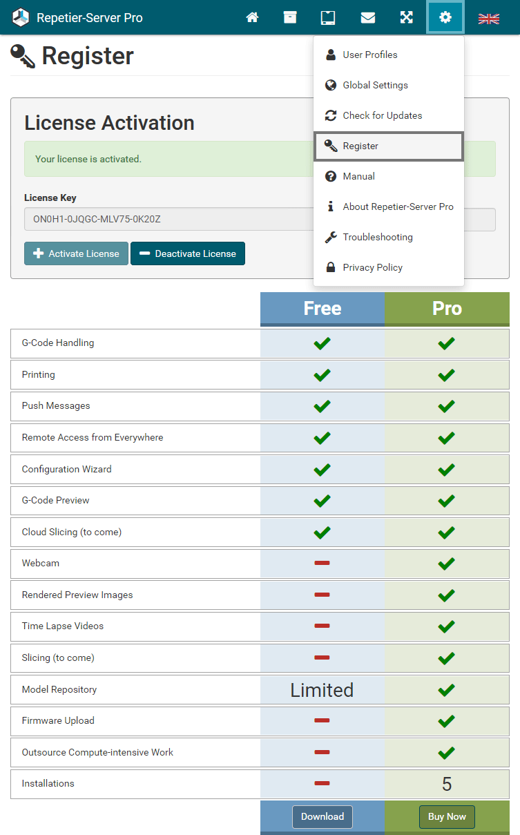 First you should download the latest version of Repetier-Server Pro from our homepage at https://www.repetier-server.com.